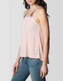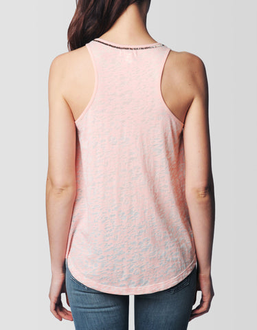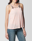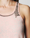 Embellished accents decorate the neckline and shoulders of this sleek tank for a boho inspired piece to pair with your favorite distressed denim. The effortless fabric and easy silhouette is just too comfy not to wear all year round. The shiny metallic details add an ideal amount of sparkle underneath a jacket or blazer so you don't have to wait until summer time to break it out. Also available in Cream and Black.